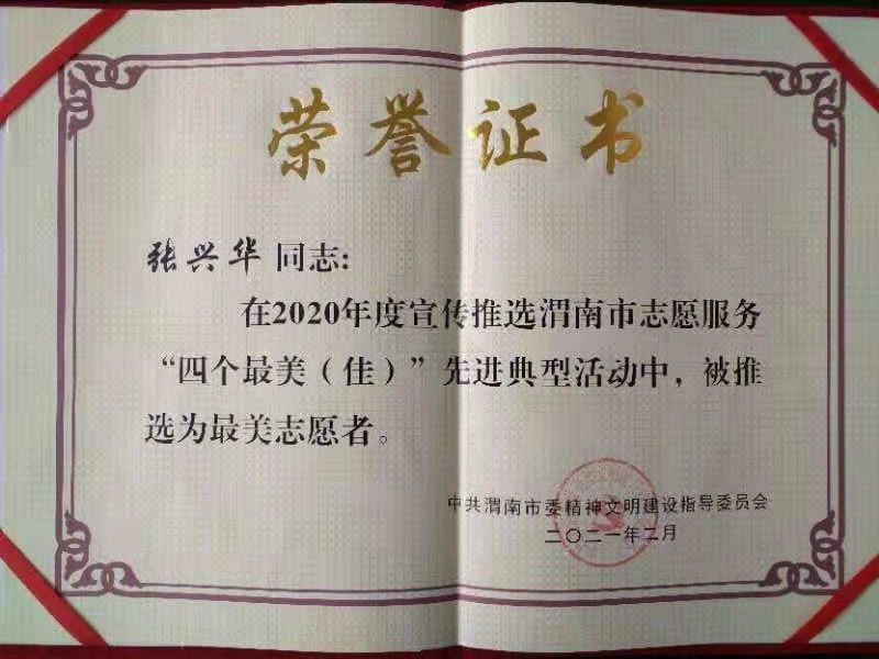 近日,渭南市委宣传部、市委文明办等11部门公布了2020年渭南市志愿服务“四个最美(佳)”先进典型名单,公司教师张兴华获“最美志愿者”荣誉称号。