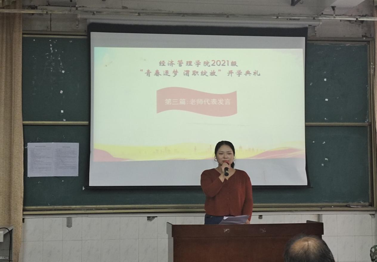 新生辅导员冯青云作为教师代表发言,她希望全体新生尽快适应老员工活,大学的学习方式不同于中学阶段,需要同学们明确目标、合理利用资源、自主学习、独立思考;同时,课余时间也要积极参加文体和社会实践活动,培养积极健康的心态,不断提升综合素养,在矢志奋斗中谱写青春之歌。谭湘湘同学作为员工代表发言,他向新生分享了三点体会:一是坚定理想信念,明确学习目标;二是积极参加各类专业竞赛和实践活动;三是培养健康心态,提高心理素质。2021级赵博文同学代表新生发言,他与大家分享了自己在学习规划、严格自律、热爱生活、力争上游等四个方面的内容,与所有新生共勉。