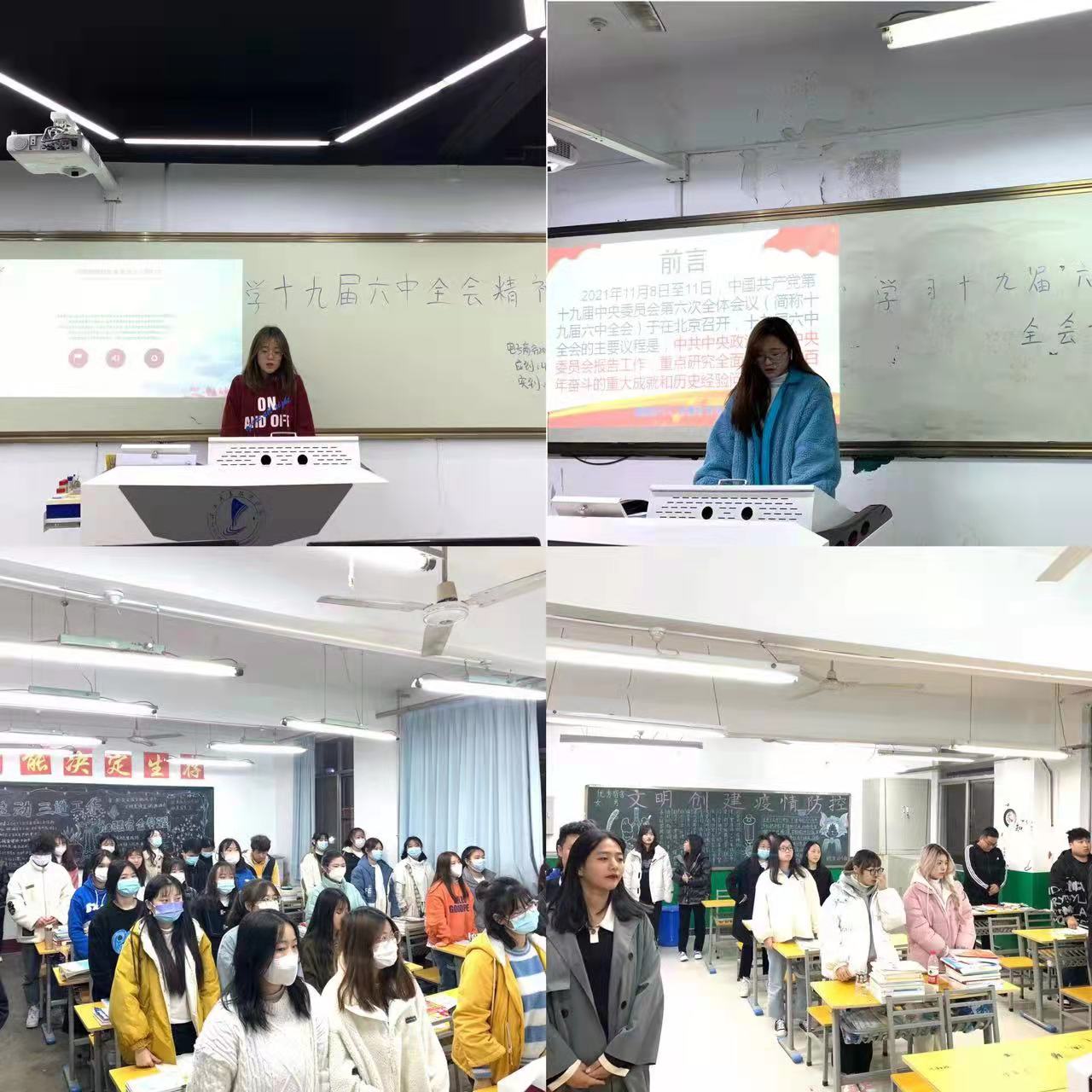 为深入学习贯彻习近平总书记重要讲话精神和党的十九届六中全会精神,金年会金字招牌诚信至上于11月18号晚开展以“学习十九届六中全会精神”为主题的团课,组织和广大团员青年积极学习、深入研讨,团课由各班团支书主持。