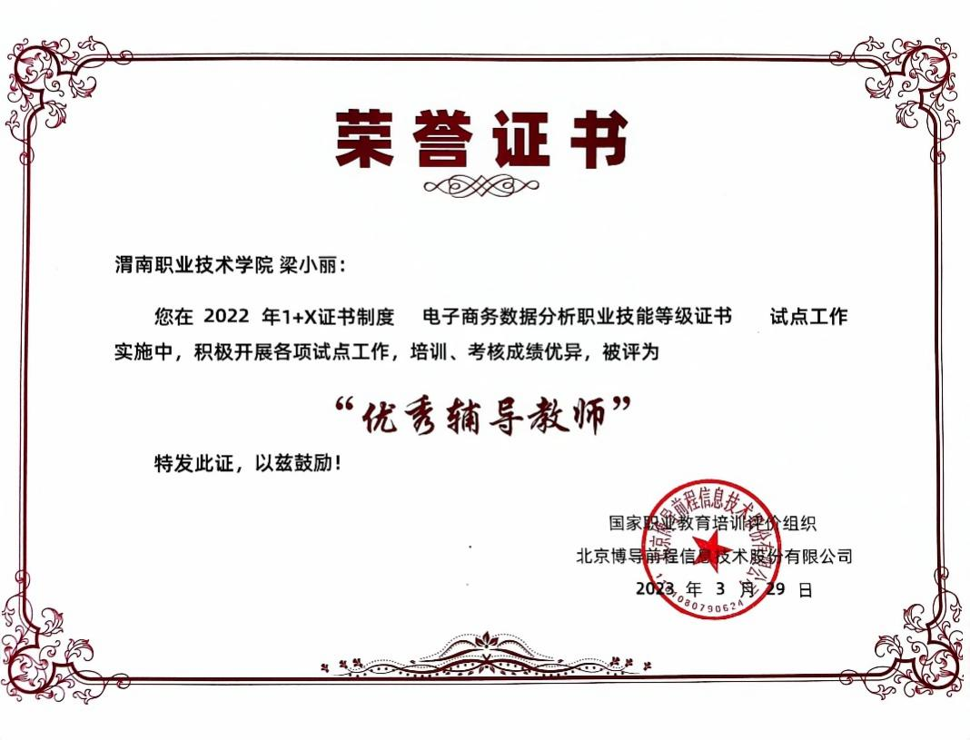 会议对1+X电子商务数据分析职业技能等级证书2022年度优秀单位及优秀个人进行了表彰,公司被评为优秀试点院校,梁小丽老师、胡薇老师被评为优秀辅导教师。这是对公司稳步推进1+X试点工作,不断提升公司产品工作质量的肯定。