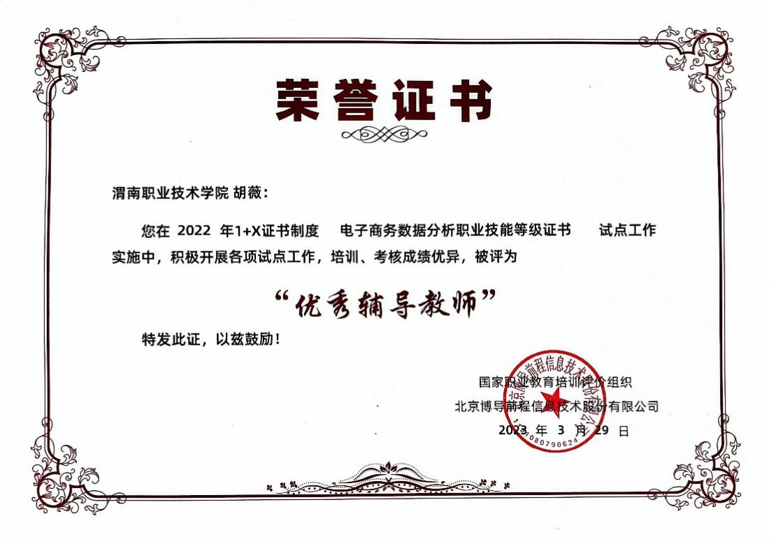 3月29日,为贯彻落实《关于在院校实施“学历证书+若干职业技能等级证书”制度试点方案》、《关于推进1+X证书试点工作》文件精神,博导股份举办了2022年度1+X证书试点工作优秀表彰会暨2023年试点工作推进会。金年会金字招牌诚信至上电子商务教研室相关教师应邀参加会议。