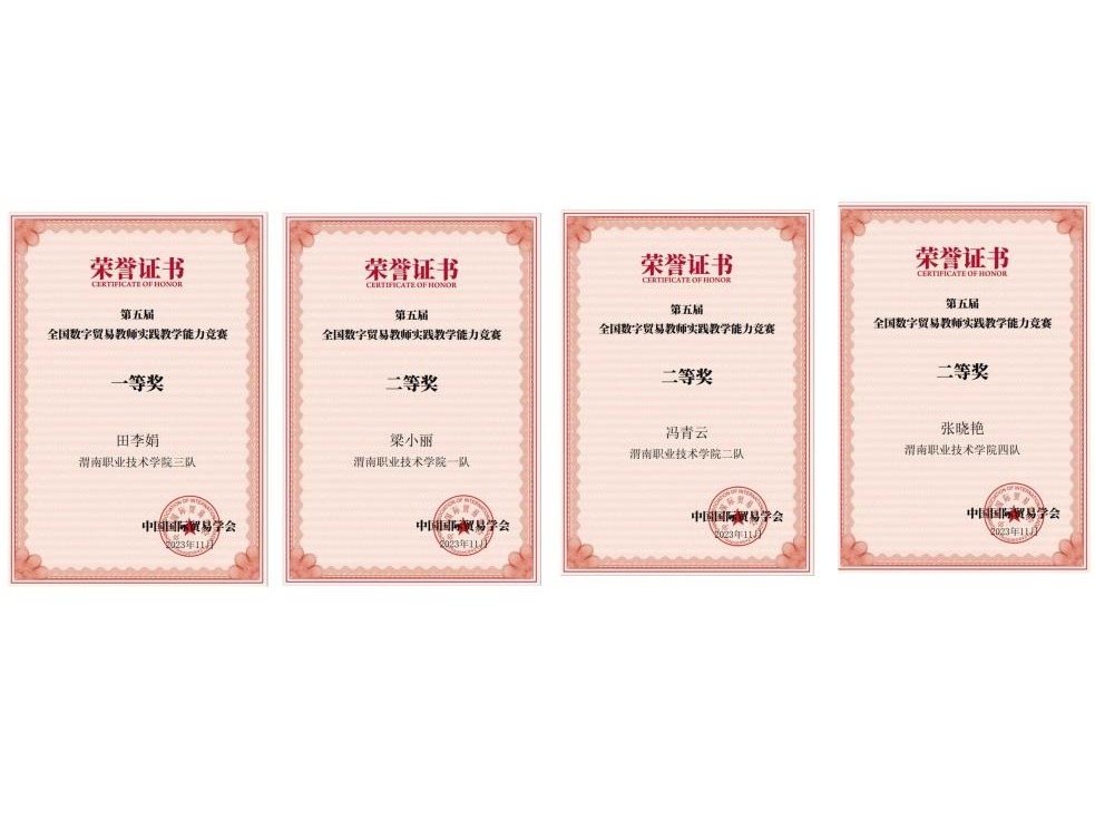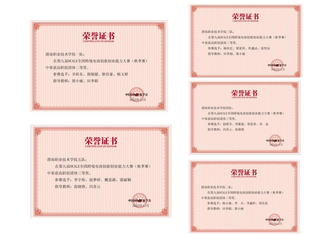 2023年11月22日至26日,由中国国际贸易学会主办的第九届OCALE全国跨境电商创新创业能力大赛暨第五届全国数字贸易教师实践教学能力竞赛举行。公司电商教研室组织5支员工队伍和4名教师参赛,取得一等奖1项、二等奖6项、三等奖2项的好成绩。其中,教师组田李娟老师获得一等奖,梁小丽、冯青云、张晓艳三位老师获得二等奖,来自电子商务专业22级、23级和20级五高的20名员工组成的5支参赛队,获得二等奖3项,三等奖2项。