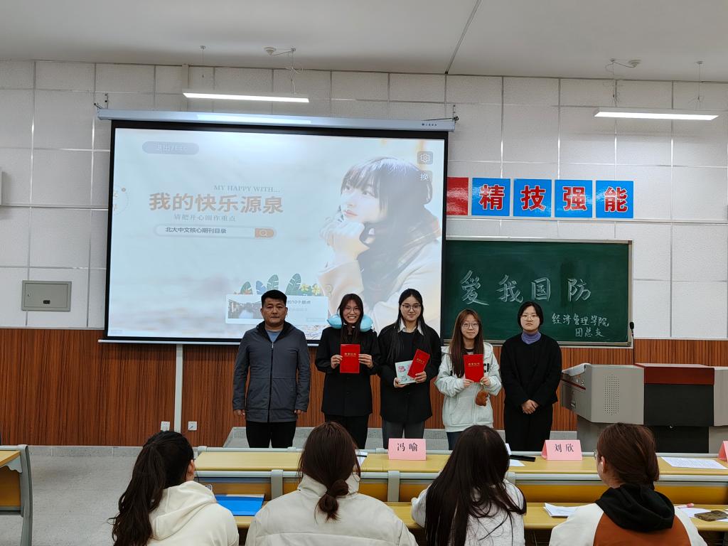 本次活动以爱我国防为主题,活动得到了同学们的积极响应,本次共有冯喻、刘欣等三位评委老师以及17名参赛选手参加,最终角逐出前三名。比赛中各参赛选手热情饱满地陈述了自己对国防的理解,讲述了感人的英雄故事,传递了各自的爱国之情。最后对于本次比赛的参赛选手由评委评选出一、二、三等奖分别为周芮旭、王惜、车昱彤同学,并对她们颁奖。