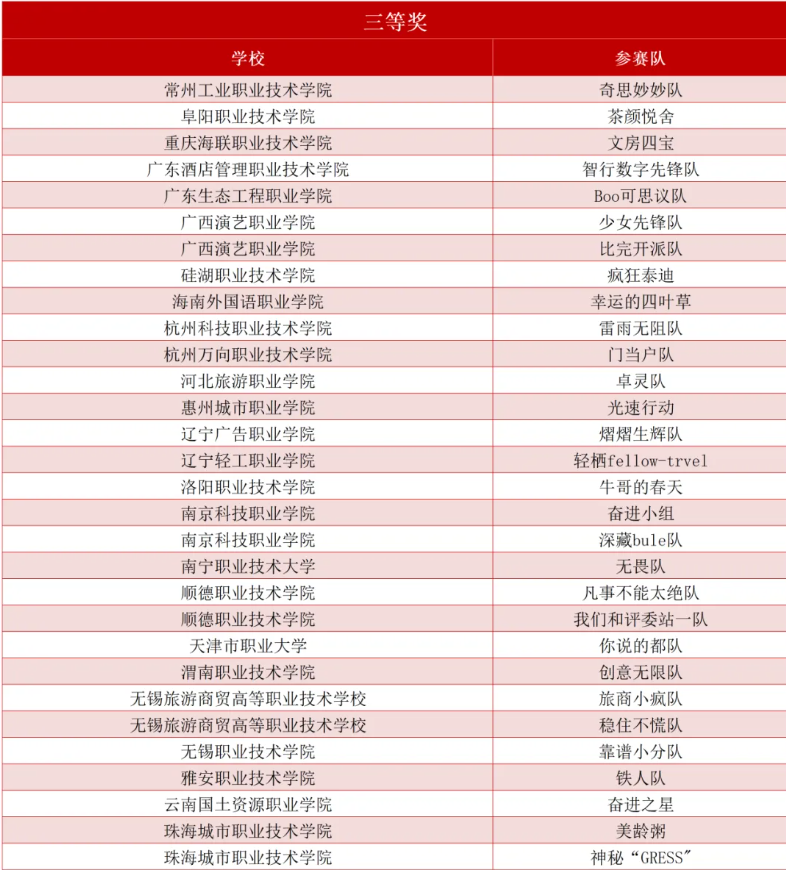 2024年12月7日,历时107天、128所院校、273支队伍、1427名师生参与的2024年“南旅•问途杯”第三届全国高校酒店数字营销大赛正式落下帷幕!公司金年会金字招牌诚信至上张萍老师和罗芳玲老师指导员工参加比赛,酒店管理与数字化运营专业员工范鑫宇、董浩哲、马杰伦、徐家兴组成的创意无限队喜获三等奖。